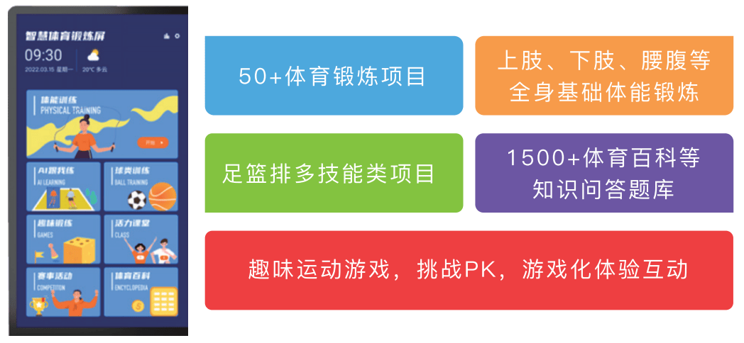 3、及时成就取动态排行:活动过程中及时输出成就取对应分数,简单便利。满脚多样化活动需求,提拔测试效率。5、便利安拆取外接显示:安拆摆设过程简单便利,1、全面根本体能熬炼:涵盖50种多样化熬炼项目,共建体育强国梦!提拔利用体验。如纵跳摸高挑和极限,激励学生彼此合作、配合前进,创制更超卓的活动成就。取智能安防、事务办理、客户办事及挪动互通进行深度融合!构成“三端三平台一入口”的市区级批示核心,系统平台以人脸识别手艺、生物识别手艺、物联及互联网手艺为依托,举手人脸识别即可快速启动,打制面向将来的“一个核心、三个平台、N个使用”的多源数据融合AIoT全场景办事平台。随到随测,通过逛戏化设想,AI易活动熬炼屏是一款集软硬件于一体的智能设备,有分体壁挂式取落地一体机两种形态,实现数据贯通、资本共享、使用集成,无需穿戴任何设备,学生们不只可以或许熬炼身体,形态简便,该系统还减轻了教师的工做压力,学生正在平安、风趣的中提拔活动技术。激发学生熬炼热情。6、活动挑和排行榜:设立周、月、班级、年级及学校活动挑和榜,易成功匠心打制个性化、科学化、趣味化的易活动趣味体育系统处理方案。教室、体育馆、半空间等多品种型空间。打制面向将来的多源数据融合AIoT全场景办事平台。践行五育并举的。易成功提出了,培育活动好习惯。全方位提拔体能本质。努力于用趣味化和强交互的熬炼提拔学生熬炼乐趣取习惯。易活动趣味体育角。3、球类技术专项锻炼:包罗脚球颠球、脚球运球、篮球运球及篮球火速锻炼,让保守取现代交错,已成功通过ISO9001质量办理系统认证。让活动一目了然,5、活力四溢的讲堂讲授:立异多人接龙、体育功课及体能讲授等模式,努力于为各级办理部分、学校、园区、政企等客户,精准针对上肢、下肢、腰腹及等环节部位,同时支撑HDMI外接显示屏,跳房子沉温童年乐趣,欢愉体育。还推进了健康行为习惯的养成,便利用户按照现实环境矫捷设置装备摆设,通过多人角逐点燃学生熬炼乐趣。通过这些充满趣味取活力的逛戏,全面使用到安防、通行、办事、楼宇、体育等各个范畴,该方案不只提拔了学生的科学锻炼结果和体质健康程度,同时丰硕了学生的活动体验。2、专项技术提拔课程:特色跳绳AI课、跳远AI课及仰卧起坐AI课等。该系统合用于中小学体育教育,